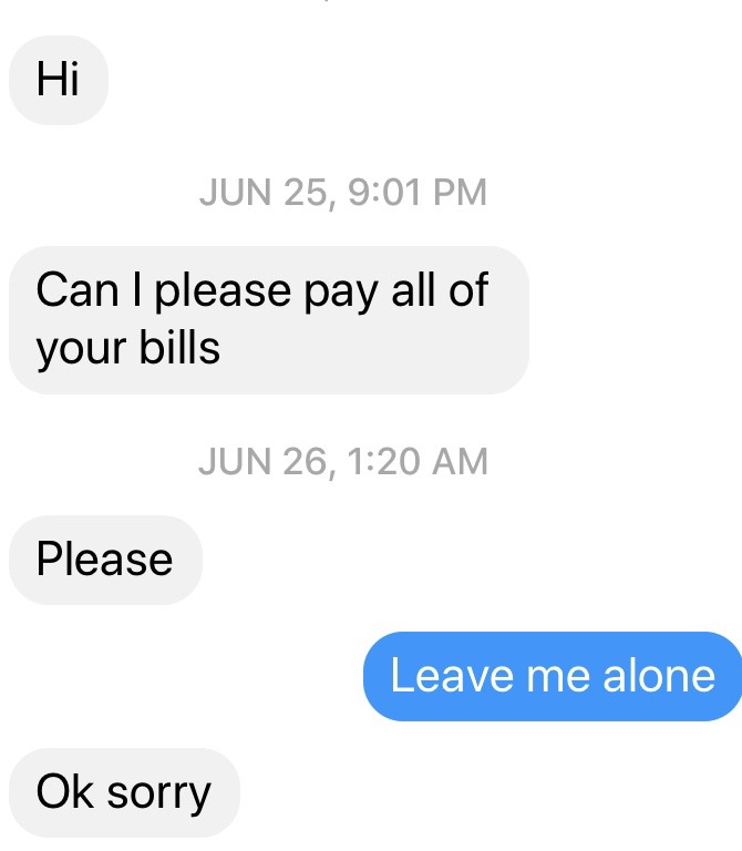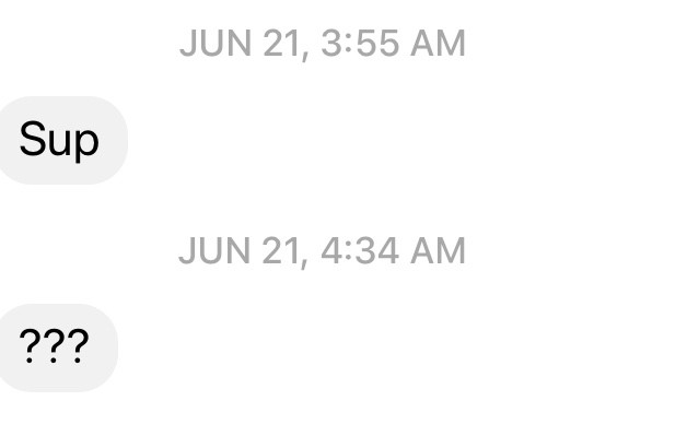 This is the only one that I got from a woman. I don’t know why she thought I would respond to “Sup?” at 3:55 in the morning but I blocked her as well once she sent me the follow up question marks.
